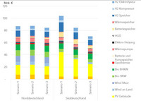 Auch bei notwendigen Speicherkapazitäten hängt die Größenordnung davon ab, wieweit der Süden mit der Windkraft kommt. 20 TWh Speicherkapazität (Szenario 3) wurden berechnet, 80 Prozent mehr wären es ohne Windausbau. In der Studie werden auch die Speichertechnologien unterschieden: Während die kurzen, täglichen Anpassungen von Erzeugung und Verbrauch durch Batterien und Pump- sowie Wärmespeicher erfolgen, wird für die saisonale Speicherung Wasserstoff vorgesehen.