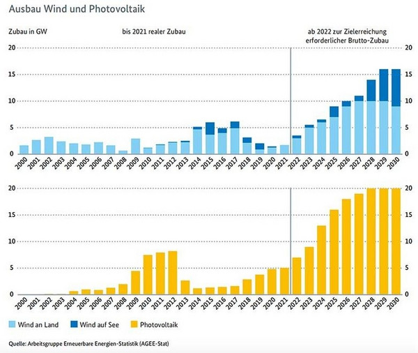 Das Ziel lautet: Eine Erhöhung von 42,6 % – der vorläufige Wert für 2021 – auf 80 % (siehe Abbildung). Entsprechend der Festlegung im Koalitionsvertrag: bei einem angenommenen Bruttostrombedarf von 680 bis 750 Milliarden Kilowattstunden im Jahr 2030. Oder als Mittelwert: 715 TWh. Demnach sollen „im EEG die Weichen für 80 Prozent erneuerbare Stromerzeugung bis 2030“ gestellt werden“, so Habeck. Es werde dabei der Grundsatz verankert, „dass der EE-Ausbau im überragenden öffentlichen Interesse ist und der öffentlichen Sicherheit dient“ (Pressemitteilung). Dabei setzt das Bundesministerium für Wirtschaft und Klimaschutz (BMWK) auf eine Erhöhung der technologiespezifischen Ausschreibungsmengen.
