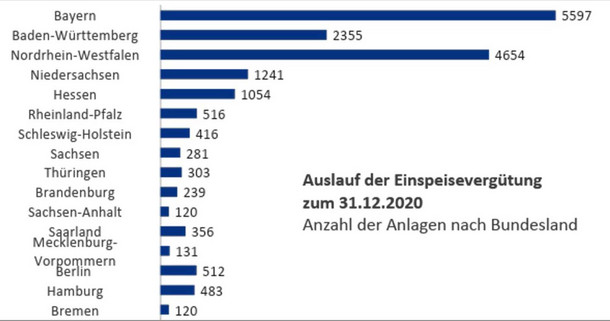 Interessant in diesem Zusammenhang, dass diese Ü20-Anlagen des Vorjahres sehr ungleich über die Bundesrepublik verteilt sind: Aufgrund der damaligen Förderbedingungen wurde im Jahr 2000 eine große Zahl von PV-Anlagen in Bayern und Nordrhein-Westfalen errichtet. Gerade aus diesen Ländern wären also Antworten wichtig.