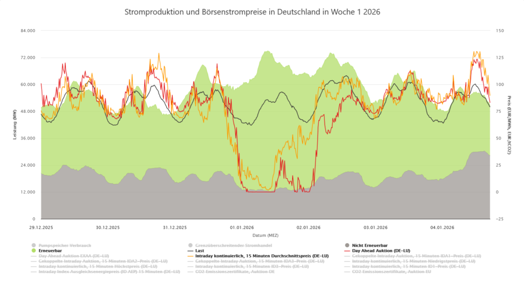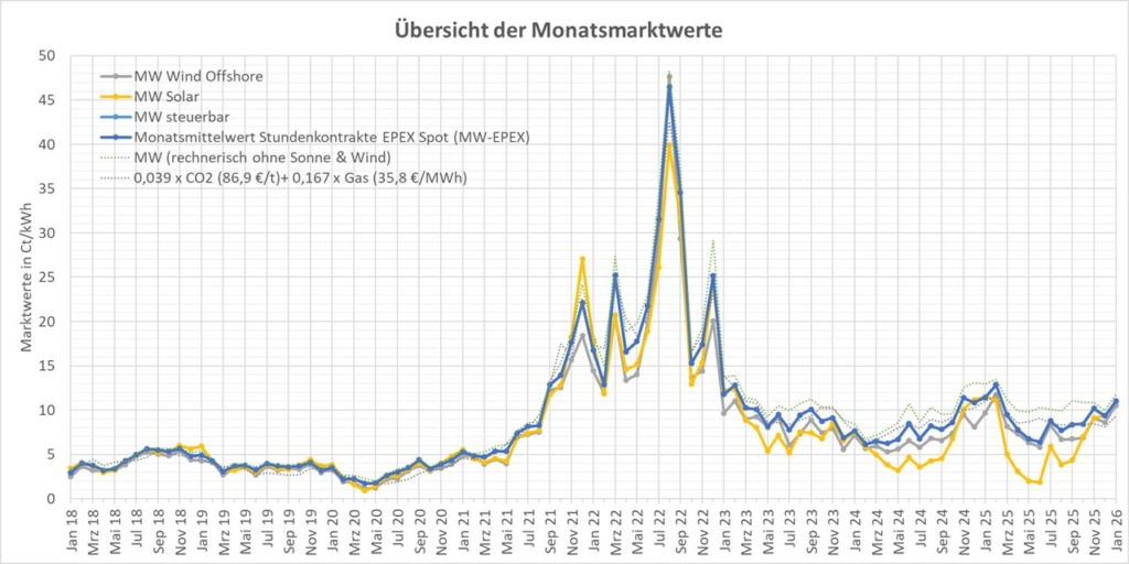 Die Monatsmarktwerte im Januar 2026 waren unspektakulär: der Monatsmittelwert an der Strombörse EPEX lag bei 11,009 Ct/kWh, und somit etwas niedriger als der Vorjahreswert (11,414 Ct/kWh, -4%), jedoch um 18% höher als im Vormonat (9,347 Ct/kWh). Wie in der letzten Marktbeobachtung aufgezeigt korreliert der Börsenpreis mit einer gewichteten Summe aus dem Preis für Erdgas (35,8 €/MWh x Faktor 0,039) und dem Auktionswert für CO2-Emissionszertifikate (86,9 €/t x Faktor 0,167). Da sich beide Werte gegenüber dem Vormonat verteuert haben, ist auch der Börsenstrompreis gestiegen. Da Solarstrom im Januar nur in geringen Mengen vorhanden ist, liegt dessen Preis nahe am Spotmarktpreis (11,019 Ct/kWh), während Wind in der ersten Kalenderwoche reichlich verfügbar war, und somit einen niedrigeren Monatsmarktwert erzielen konnte. Interessantes beobachte ich bei den negativen Strompreisen!