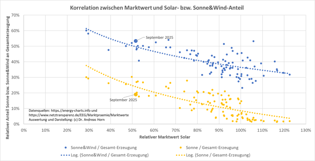 Der Anteil von Solarstrom an der öffentlichen Stromerzeugung lag bei 19,1%, der Anteil von Sonne und Wind gemeinsam an der Stromerzeugung lag bei 53,4 Prozent. Die Frage ist, ob man eine Korrelation zwischen dem relativen Marktwert Solar bzw. Sonne und Wind im Verhältnis zum Solar- bzw. Sonne & Wind-Anteil an der Stromerzeugung findet?