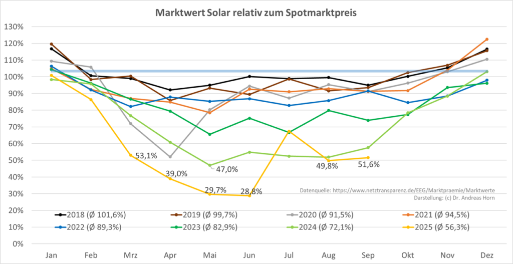 In früheren Beiträgen in der DGS-News-Serie zu den Monatsmarktwerten haben wir bereits verschiedene Darstellungsvarianten für die Monatsmarktwerte gezeigt. In „Marktwert Solar – welchen Preis hat Solarstrom?“ wurde die einfache Zeitreihe dargestellt und die saisonale Entwicklung der Marktwerte Solar und Wind im Verhältnis zum Gesamtmarkt erläutert. In „Der Monatsmarktwert Solar im Juni 2025“ wurde erstmals die jährliche Darstellung für den Marktwert Solar gezeigt, der mit steigender PV-Ausbauleistung eine immer tiefere „Wanne“ im Sommerhalbjahr zeigt. In der Auswertung der Monatsmarktwerte für August 2025 wurde bereits die Korrelation für Solarenergie gezeigt.