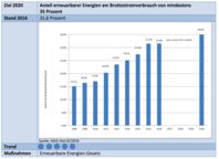 Im Monitoringbericht steht unter Erneuerbare Energien im Stromsektor: „Mit 189,7 TWh wurde im Jahr 2016 nur geringfügig mehr Strom aus erneuerbaren Energien erzeugt als im Vorjahr (2015: 188,8 TWh). Sie konnten jedoch witterungsbedingt, trotz großer Steigerung der installierten Leistung, nicht für einen entsprechenden Zuwachs bei der erzeugten Strommenge sorgen und erreichten einen Anteil von 31,6 Prozent (2015: 31,5 Prozent) am Bruttostromverbrauch. Der Anteil der Erneuerbaren Energien im Stromsektor hat sich seit 2008 mehr als verdoppelt. Auf dem Weg zu einer sicheren, bezahlbaren und umweltverträglichen Energieversorgung hat die Bundesregierung damit schon viel erreicht. So ist der Anteil der Erneuerbaren Energien am Bruttostromverbrauch im Jahr 2017 auf 36,2 Prozent gestiegen – der bislang stärkste Anstieg innerhalb eines Jahres. Damit ist das 2020-Ziel (35 Prozent) bereits im Jahr 2017 übertroffen.“ (Siehe Abbildung 3).