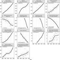 Zeitreihen der Klimareaktion von 1979 bis heute. Die in den Feldern dargestellten Raten sind die dekadischen Veränderungsraten für die gesamten Bereiche der Zeitreihen. Diese Raten sind in Prozent angegeben, mit Ausnahme der Intervallvariablen (d, f, g, h, i, k), bei denen stattdessen additive Änderungen angegeben sind. Für den Säuregrad der Ozeane (pH-Werte) basiert die prozentuale Rate auf der Veränderung der Wasserstoffionenaktivität, aH+, wobei niedrigere pH-Werte einen höheren Säuregrad darstellen. Die jährlichen Daten werden mit grauen Punkten dargestellt. Bei den schwarzen Linien handelt es sich um glatte lokale Regressionstrendlinien. Quellen und zusätzliche Details zu jeder Variablen sind in der Zusatzdatei S2, einschließlich Tabelle S3, zu finden.