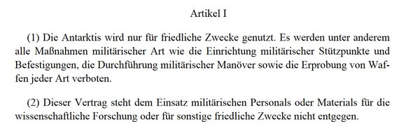 Das Besondere am Antarktisvertrag ist, dass in diesem Übereinkommen festgelegt wurde, dass „alle Maßnahmen militärischer Art wie die Einrichtung militärischer Stützpunkte und Befestigungen, die Durchführung militärischer Manöver sowie die Erprobung von Waffen jeder Art verboten“ sind (siehe Artikel I). Auch „Kernexplosionen und die Beseitigung radioaktiven Abfalls sind in der Antarktis verboten“ (Artikel V). Die zwölf Unterzeichnerstaaten – Argentinien, Australien, Belgien, Chile, Frankreich, Japan, Neuseeland, Norwegen, Südafrika, die UdSSR, Großbritannien und die USA – beschlossen, das ökologische Gleichgewicht am Südpol zu bewahren und wissenschaftliche Forschung zu unterstützen. Der Vertrag wurde in Englisch, Französisch, Russisch und Spanisch verfasst. Dank des Vertragswerkes ist der Kontinent auch nach 61 Jahren demilitarisiert und atomwaffenfrei geblieben.
