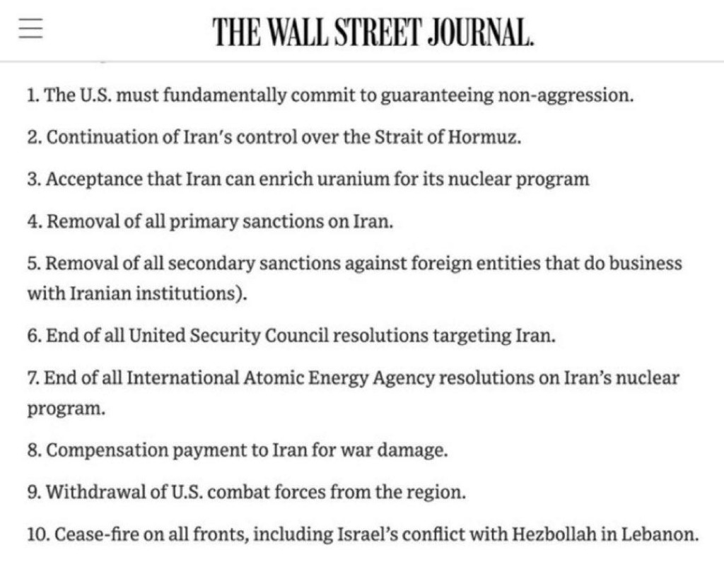 Apropos totaler Sieg über den Iran: Wer die zehn Bedingungen gelesen (oder auf unserem Titelbild angeschaut) hat, zu denen die iranische Regierung, beziehungsweise ihre Revolutionsgarden überhaupt einem Kriegsende zustimmen würden, wird eher von einer totalen Niederlage der USA ausgehen. Und dass Israel dem 10. und letzten Punkt des Iran-Plans zustimmen wird, haben Netanjahu und Co. ja gleich deutlich mit neuen Angriffen auf die Hisbollah und damit einem klaren „Nein!“ beantwortet.