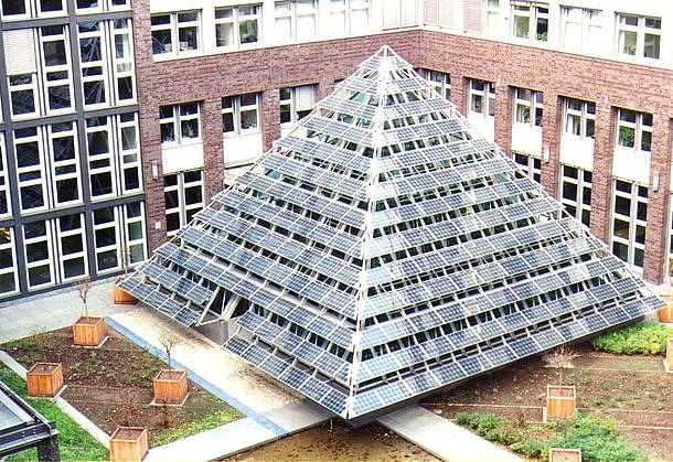 Diese schon optisch besondere Photovoltaik-Anlage wurden im Jahr 1996 am Hauptsitz der damaligen Bewag – heute Vattenfall – in Berlin-Treptow installiert. Die Module sind transluzid, haben also eine transparente Rückseitenfolie, so dass zwischen den Zellen noch genügend Licht ins Innere fällt und die darin liegende Cafeteria verschattet. Die Herausforderungen waren vielfältig: Einerseits galt es, die Modulreihen an die 52° geneigte Pyramidenkontur und ihr Fensterraster anzupassen. Andererseits sollte durch einen Anstellwinkel der Module von 30° die Anlage auf einen maximalen Jahresertrag hin optimiert werden. Diese ästhetischen und technischen Überlegungen erforderten die Anfertigung eines rechteckigen und 12 verschiedener trapezförmiger Modultypen. Die Akut Solar- und Haustechnik aus Berlin – seit 1988 im Bereich Solar-, Heizungs- und Sanitärtechnik aktiv – hat die Anlage im Jahr 1996 installiert.