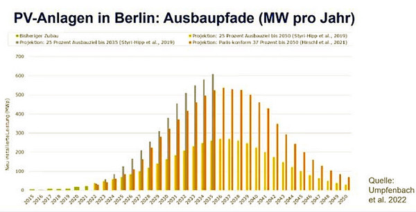 Das bisherige Ziel der Ampelkoalition für den Ausbau der Photovoltaik in Deutschland beträgt 200 GW (die DGS-News berichteten). Außerdem soll eine Nutzung von Mieterstrom leichter möglich werden. Laut Umpfenbach habe die EEG-Förderung gut für Einfamilienhäuser und im Gewerbebereich funktioniert. Doch für Mehrfamilienhäuser, und die prägen das Berliner Stadtbild, sind die Mieterstrommodelle „relativ aufwendig“ fasst sie die Situation zusammen.