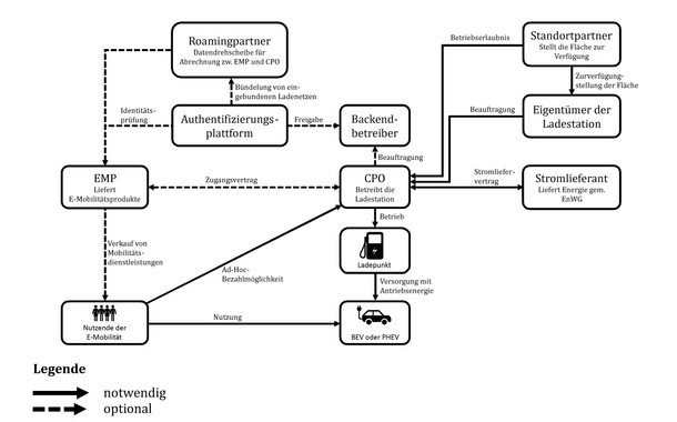 Strukturiert werden die Kosten von Infrastrukturmaßnahmen und Förderprogramme aufgelistet, auch Schaubilder der beteiligten Rollen beim Betrieb (siehe Bild 2) werden aufgezeigt. Eine Liste nennt bundesweit alle nationalen und länderweiten relevanten Förderprogramme. Schematisch wird dann auf die einzelnen Schritte der Planung eingegangen.