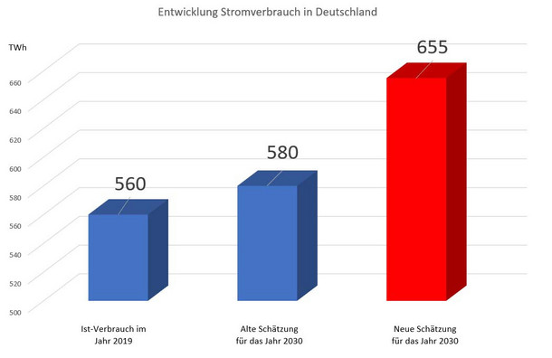 Doch klar ist: Der Stromverbrauch in Zukunft wird zunehmen, es muss deutlich mehr zugebaut werden als bisher vorgesehen, gerade um auch das Ende des Kohlestroms und die Abschaltung der letzten AKWs im Dezember 2022 auszugleichen. Die bisherige, schon seit längerem kritisierte Abschätzung des BMWi für das Jahr 2030 hatte einen deutschen Jahresstromverbrauch von 580 Terawattstunden (TWh) prognostiziert, bevor der Bundeswirtschaftsminister die Prognose in diesem Juli korrigierte – auf 655 TWh. Unterstellt werden dabei im Jahr 2030 u.a. 14 Mio. Elektro-Pkw, 6 Mio. Wärmepumpen und 30 TWh Strom für grünen Wasserstoff.