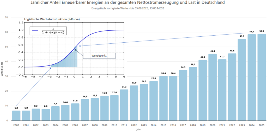 Ein wichtiger Teil der Energiewende ist die Stromerzeugung: der jährliche Anteil Erneuerbarer Energien liegt mittlerweile bei über der Hälfte – mit steigender Tendenz. In den EnergyCharts des Fraunhofer ISE ist das Wachstum gut zu erkennen: die Form entspricht einer sogenannten „logistischen Funktion“ bzw. Wachstumskurve. Der Wendepunkt dieser S-Funktion markiert den Punkt, an dem die Wachstumsgeschwindigkeit am höchsten ist und die Kurve von einer Linkskurve zu einer Rechtskurve übergeht.