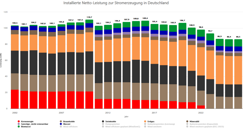 Zu Beginn der Energiewende gab es das Problem der Dunkelflaute schlicht nicht: Kraftwerke waren ohnehin mit ausreichender Leistung vorhanden und sind ständig gelaufen. Mittlerweile sind einerseits die Laufzeiten der fossil befeuerten Kraftwerke stark gesunken – was diese „unwirtschaftlich“ macht. Auch deshalb hat die Gesamtleistung der Kraftwerke, die „gesichert“ Strom liefern können, bereits deutlich abgenommen. Während vor 10 Jahren noch rund 110 GW gesicherte Kraftwerksleistung am Netz war, sind es jetzt noch 86 GW – immer noch genug. Aber gemäß Kohleausstiegsgesetz werden bis 2030 rund die Hälfte, und bis spätestens 2038 die kompletten 30 GW Kohlekraftwerksleistung abgeschaltet. Die verbleibenden 56 GW gesicherte Kraftwerksleistung reicht dann nicht mehr, um den zunehmenden Strombedarf für Wärme und Mobilität in Dunkelflauten sicher zu decken.