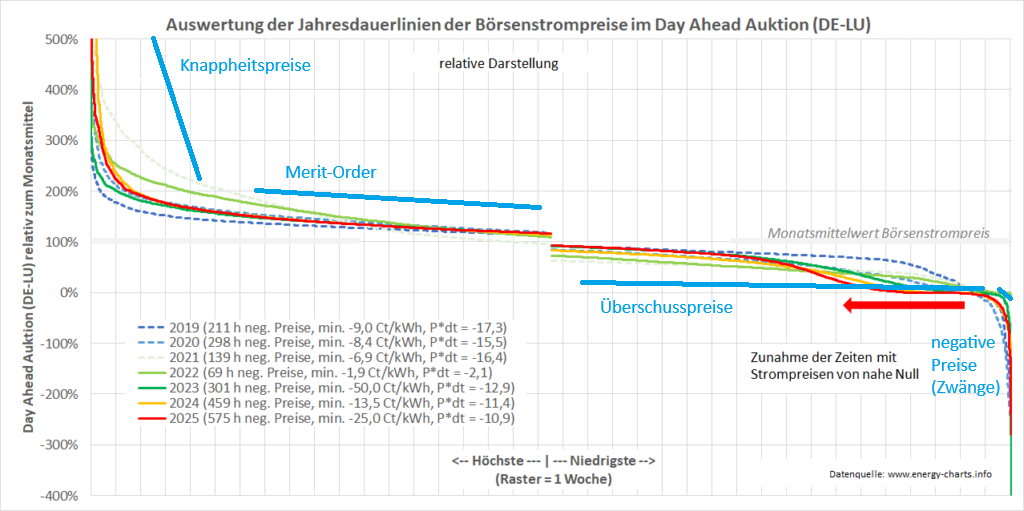 Anhand der Entwicklung der Börsenstrompreise in den letzten Jahren, in denen die Energiewende schon nahe am Wendepunkt war, kann man versuchen vorherzusehen, wie sich die Strompreise mit weiter steigendem Angebot von Solar- und Windstrom, sowie mehr Batteriespeichern entwickeln werden.