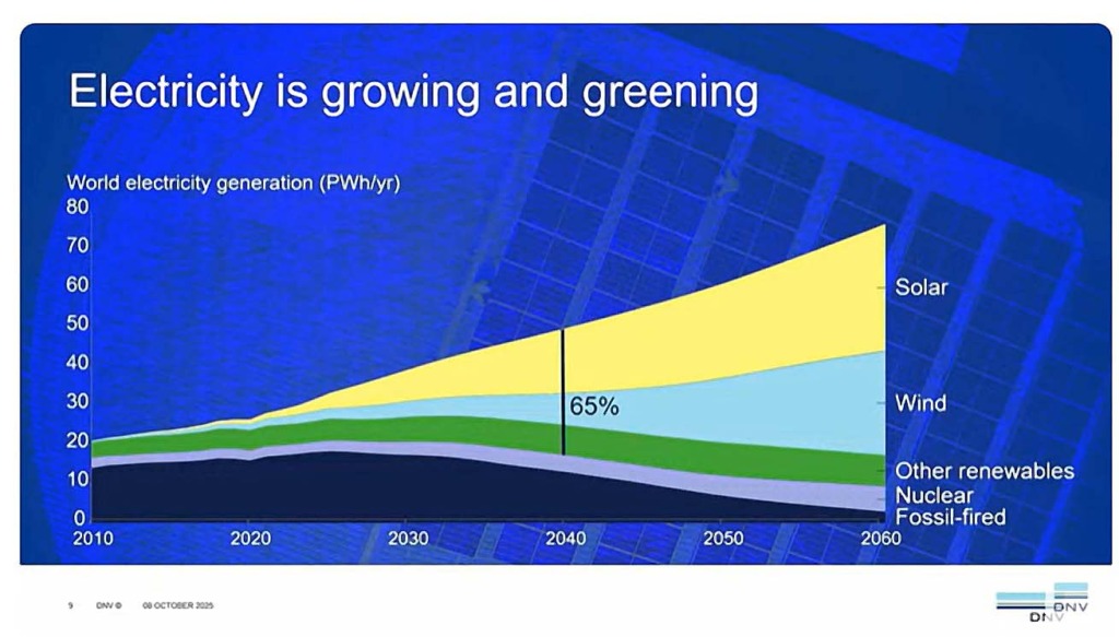 Eine weitere gute Nachricht: Die Elektrifizierung sei ein Megatrend und zugleich ein großer Schritt wegen der großen Energieeffizienz. Der weltweite Stromverbrauch steige rasch, aber der Anteil der erneuerbaren Stromerzeugung steige noch schneller; DNV erwartet bis 2040 einen weltweiten EE-Anteil von 65 % beim Strom, der Hauptteil davon werde von der Solarenergie getragen