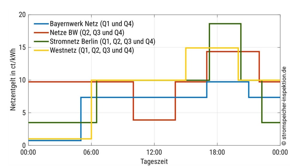 Sinn oder Unsinn von dynamischen Stromtarifen in Kombination mit einem Batteriespeicher wurden in diesem Jahr ebenfalls genauer betrachtet. Wichtig bei der Wahl eines dynamischen Tarifes ist immer, dass auch ausreichend Stromverbraucher zur Verfügung stehen, die zeitlich variabel betrieben werden können. Ist dies nur die Waschmaschine, kann ein fester Tarif ähnlich wirtschaftlich sein wie ein dynamischer. Kann der Haushalt aber das Laden eines E-Autos oder die Laufzeit der Wärmepumpe um Stunden verschieben, dann kann ein dynamischer Stromtarif auch finanziell Sinn machen. Wallbox und Wärmepumpe zählen außerdem als „steuerbare Verbraucher“ nach §14a EnWG und profitieren meist zusätzlich von reduzierten Netzentgelten. Diese Reduzierung ist – wie im Bild 3 sichtbar – jedoch vom Netzbetreiber abhängig.