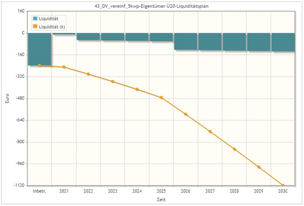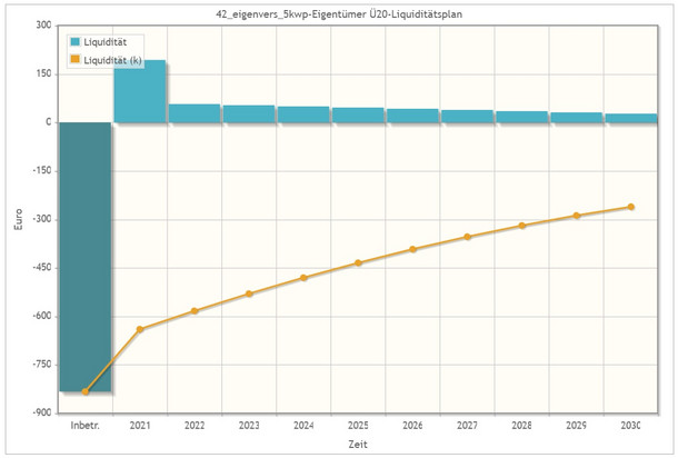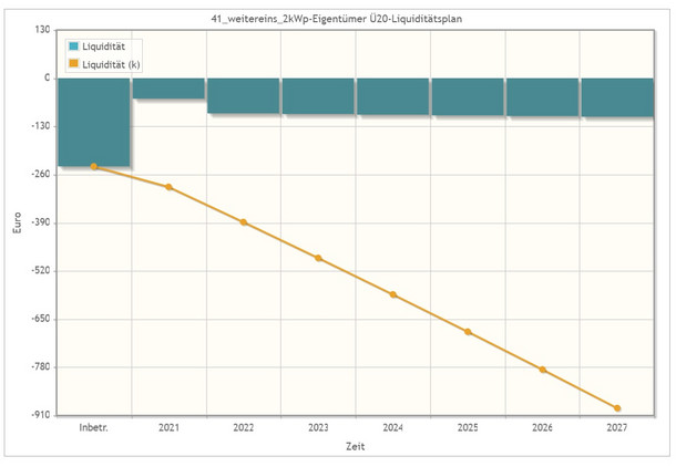 Grafisch als Liquiditätsverlauf sieht das dann so aus (In Blau die jährlichen Einnahmen und Ausgaben, in orange der Verlauf des finanziellen „Kontostands“ der Anlage. Nach sieben Jahren Weiterbetrieb verharrt der Endpunkt bei knapp minus 900 Euro. Der Weiterbetrieb ist somit deutlich unwirtschaftlich):
