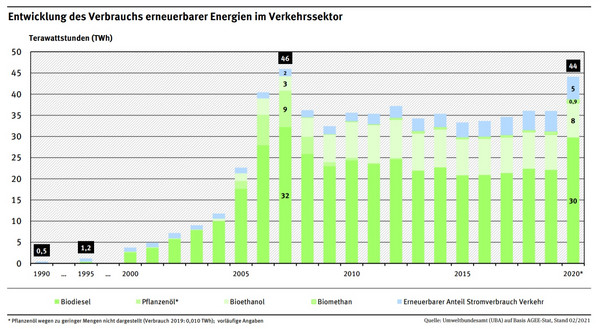 Dass die Klimaschutzbestrebungen in den vergangenen Jahren nicht vorangekommen sind, ist eine Meldung nicht wert. Fahrleistungen sind nicht gesunken, der Durchschnittsdurst eines PKW auch nicht und ein generelles Tempolimit auf Autobahnen, um auf einen Schlag pro Jahr 1,9 Mio. Tonnen CO2 einzusparen (bei Tempo 130) und nebenbei die Verkehrssicherheit zu erhöhen, ist nach wie vor auch aktuell politisch nicht mehrheitsfähig. Gerade einmal 7,3 Prozent betrug 2020 der Anteil der erneuerbaren Energien im Verkehrsbereich, so das Umweltbundesamt in einer Veröffentlichung beschrieben hat. Und dabei ist der erneuerbare Strom für den Bahnverkehr und die Elektroautos schon enthalten. Wie Bild 2 zeigt, hat sich an dem Anteil im zehn Jahren zwischen 2009 und 2019 praktisch nichts verbessert. Sichtbar ist aber: In 2020 gab es einen leichten Sprung bei der Nutzung des Biodiesel. Welche Ursache hat dieser Sprung?