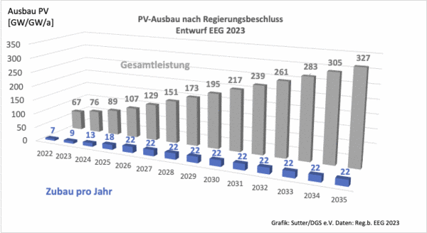 Als weiterer positiver Aspekt sei noch erwähnt, dass im jetzigen Regierungsbeschluss auch die Ausbaupfade nochmals nach oben angepasst wurden: Nicht mehr 20 GW, sondern 22 GW sollen als jährlicher PV-Zubau erreichet werden und dieser Wert soll nicht erst im Jahr 2028, sondern schon 2026 erreicht werden. Bild 2 zeigt die Ausbauziele in grafischer Darstellung.