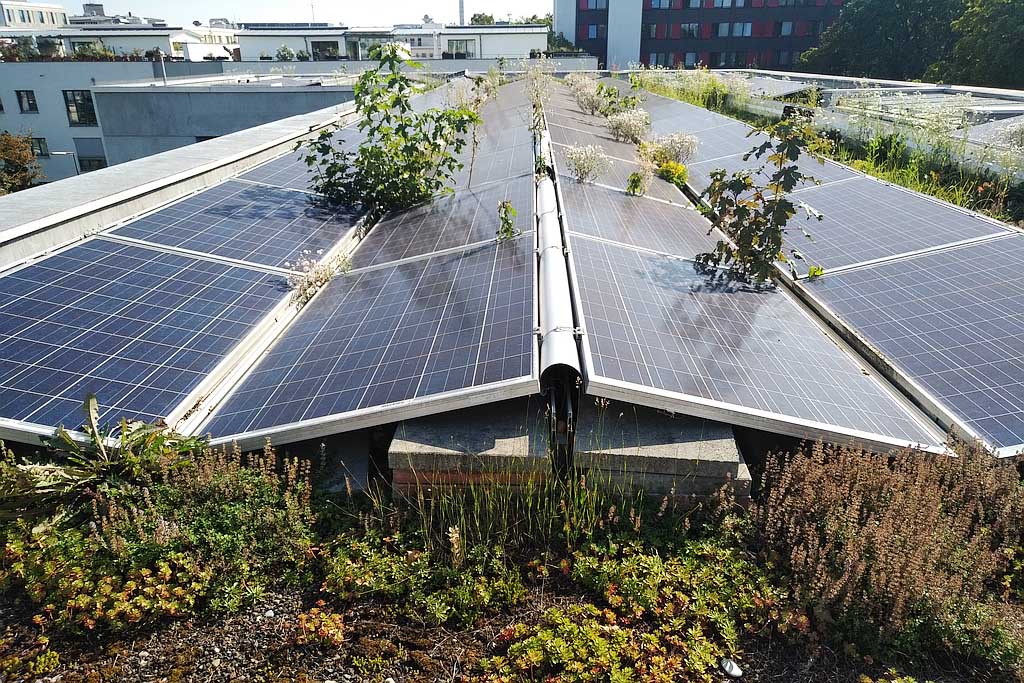 Die Zukunft gehört Hybriden: weitgehend flächendeckend und für die leichte Pflege der Begrünung hochaufgestellte Solarmodule bzw. Pergolen über Dachoasen mit schattentoleranten Pflanzen und Büschen, die Biodiversität, Kühlung und Energieerzeugung optimal vereinen. Leider wird dies von der bestehenden Bauleitplanung häufig durch ungeeignete Rahmenbedingen verhindert. Viele heute übliche niedrige und „lückige“ PV über Grün-Lösungen sind ein fragwürdiger Kompromiss mit halber PV-Leistung, bei längeren Trockenphasen suboptimaler Kühlwirkung, aber immerhin guter, wenn auch pflegeintensiver Biodiversität. Um Klimaneutralität mit Hilfe lokaler Stromproduktion in den Städten wirklich erreichen zu können, müssen Blockaden für den PV-Ausbau abgebaut werden.
