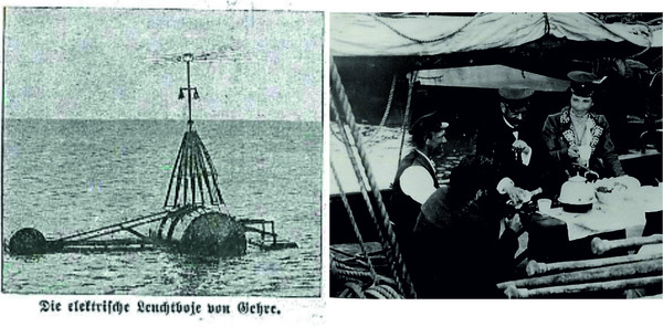 Das erste war eine Leuchtboje bzw. Signaltonne zur Kenntlichmachung des Fahrwassers, die aus einer Wellenkraftmaschine ihren Strom bezog, und am 04.09.1900 in (Test-)Betrieb ging. Das „Schwiegermutter“ genannte Seezeichen bestand aus einer eisernen waagerechten Tonne mit 3,5 m Länge und einem Durchmesser von 1,5 m. An ihr war auf der einen Längsseite ein längerer Ausleger mit Schwimmer angebracht, der das Umkippen bzw. Durchkentern bei stärkerem Seegang verhindern sollte. Auf der anderen Seite befand sich ein kleinerer Schwimmer, der über einen Hebelmechanismus, Zahnräder und Sperrklinken ein Gewicht im Inneren der Tonne anhob. Wenn dieses Gewicht den oberen Totpunkt überschritten hatte, senkte es sich herab und trieb dabei einen Dynamo an, von dem eine elektrische Leitung zu einer Lampe und einer Nebelglocke in ca. 4 m über der Tonne führte. Da die Leuchtboje nur den Schwerkraftspeicher hatte, konnte sie nur bei Wellengang leuchten – und auch dann nur in der Zeitspanne, in der sich das Gewicht nach unten senkte und so den Dynamo antrieb.