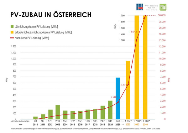 Der Bundesverband Photovoltaic Austria (PV Austria) fordert, dass bis 2030 ein PV-Ausbau auf 13 GWp erreicht wird, und zehn Jahre später auf 30 GWp. Das würde einen Anteil am Stromverbrauch von 15 Prozent (2030) und von 27 Prozent (2040) entsprechen. In der oben erwähnten Pressemeldung nennt PV Austria-Vorstandsvorsitzender Herbert Paierl mehrere Hürden, die noch beim Ausbau der Photovoltaik bestehen. Demnach fehlen „ausreichend ausgewiesene Flächen für Photovoltaik“ und „die Beschleunigung der Genehmigungsverfahren“.