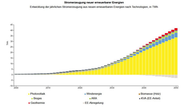 Die Studienautoren argumentieren, dass die derzeitigen vom schweizerischen Bundesrat aufgestellte Zielvorgabe von einem Ausbau der Stromproduktion mit Erneuerbaren Energien, ohne Wasserkraft, bis 2035 von 17 TWh „unzureichend [sei], um rechtzeitig die wegfallenden Atomkraftwerke zu ersetzen und den zusätzlichen Strombedarf für die Dekarbonisierung sicherzustellen“. Stattdessen sei dafür eine zusätzliche Produktion von 38 TWh erforderlich, wie eine Studie des Instituts for Sustainable Futures der University of Technology Sydney im Auftrag von Greenpeace Schweiz ermittelt hat. Dies würde eine Erhöhung der aktuellen Produktion um den Faktor 12 entsprechen. Die Bedeutung des Ausbaus der Photovoltaik unterstreicht auch die Veröffentlichung des schweizerischen Bundesamts für Energie „Energieperspektiven 2050+“, die in der Studie ebenfalls zitiert wird. Die Entwicklung der Stromproduktion gemäß „Energieperspektiven 2050+“ zeigt Abbildung 2.