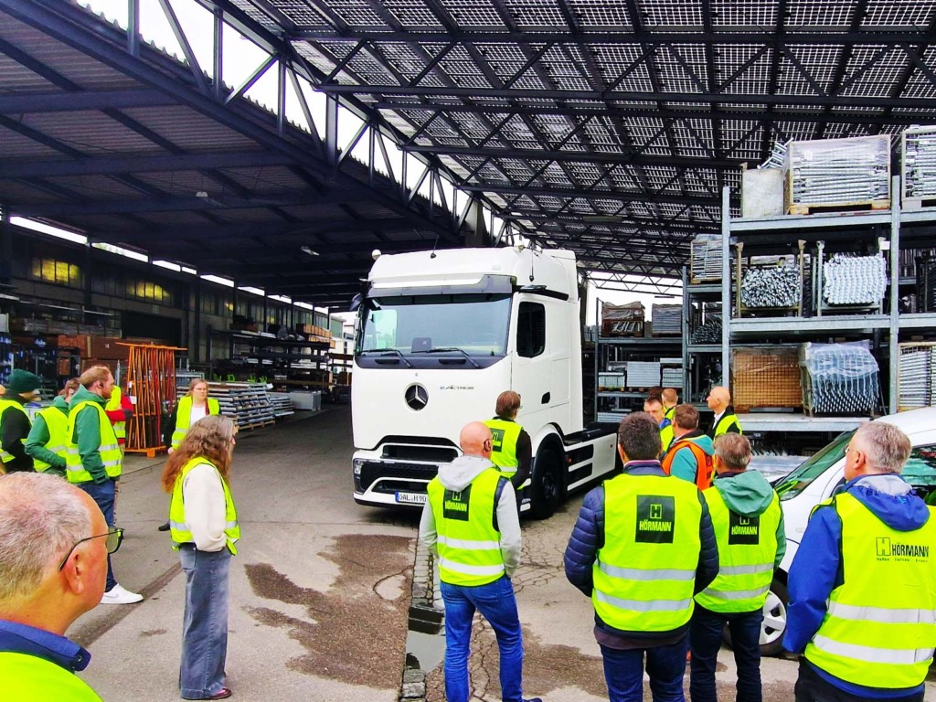 Dass inzwischen sämtliche Staplerfahrzeuge elektrisch unterwegs sind und sogar am Tag der Veranstaltung ein nagelneuer e-Actros, ein rein elektrischer LKW von Mercedes, an Hörmann übergeben wurde, rundet den durchgängigen Zukunftsbezug ab. Der LKW soll zukünftig im täglichen Pendelverkehr zu einer Verzinkerei eingesetzt und auf dem Hörmann-Firmengelände mit möglichst viel eigenem PV-Strom geladen werden.