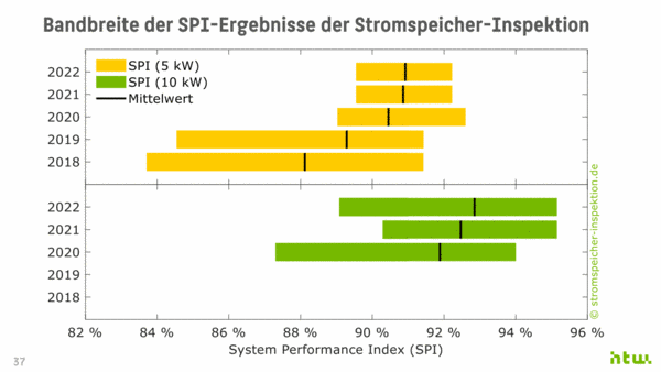Bei den besten Platzierungen gab es in diesem Jahr keine Überraschungen: In beiden Leistungsklassen konnten die letztjährigen Testsieger ihre Platzierungen verteidigen: In der kleinen Klasse setzte sich erneut der Hybridwechselrichter Fronius Primo GEN24 6.0 Plus mit der BYD Battery-Box Premium HVS 7.7 durch, in der großen Klasse der Power Storage DC 10.0 von RCT Power mit einem SPI (10 kW) von 95,1 %. Neben der Kürung der besten Anbieter fällt vor allem auf, dass sich über die vergangenen Jahre die Spanne des SPI deutlich verkleinert hat (siehe Bild 4) und der Mittelwert von Jahr zu Jahr leicht verbessert. Das ist ein gutes Zeichen für die Anwender, die auch finanziell von einem besseren Wirkungsgrad und weniger Verlusten profitieren. Die Testergebnisse bestätigen, dass viele Hersteller wichtige Stellschrauben zur Effizienzsteigerung erkannt und ihre Geräte optimiert haben. Es sind zunehmend mehr hocheffiziente PV-Speichersysteme am Markt erhältlich.