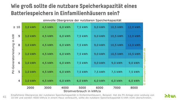 Sicher ist: Die durchschnittliche Größe der verkauften Speichersysteme wird immer größer, laut BSW lag diese im vergangenen Jahr bei 8 kWh. Die HTW hat in der Speicherinspektion auch eine Empfehlung zur sinnvollen Systemauslegung integriert, die in Bild 5 zu sehen ist. Danach sollte die Speichergröße nach der Größe der PV-Anlage und des jährlichen Stromverbrauchs ausgewählt werden. Eine weitere Vergrößerung über die in Bild 5 angegebenen Größengrenzen hinaus bietet in der Praxis nahezu keinen Vorteil für Eigenverbrauchsanteil und Autarkie. Zwei naheliegende Ausnahmen werden in der Studie genannt: Zum einen, wenn das System auch Not- oder Ersatzstrom liefern soll. Zum anderen, wenn zukünftig ein höherer Stromverbrauch, z.B. durch Anschaffung einer Wärmepumpe oder eines Elektroautos absehbar ist. In diesen Fällen kann vorausschauend schon ein größerer Speicher installiert werden. Es gibt jedoch auch die Möglichkeit – allerdings nur bei einigen, nicht allen Speichersystemen -, dass auch nach einigen Jahren einzelne Batteriemodule nachgekauft werden können und der Speicher dann nach Bedarf vergrößert werden kann. Ein Dank gilt auf alle Fälle dem Team der HTW für die Untersuchungen und die anschauliche Aufbereitung der Ergebnisse.