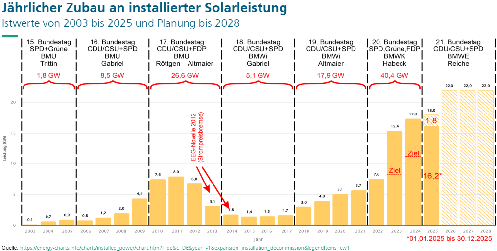 Quelle: Fraunhofer ISE, Stromerzeugung in Deutschland im Jahr 2025, Folie 101, https://www.solarwirtschaft.de/datawall/uploads/2025/10/BSW-Solar_Fact_sheet_Solar_PV.pdf