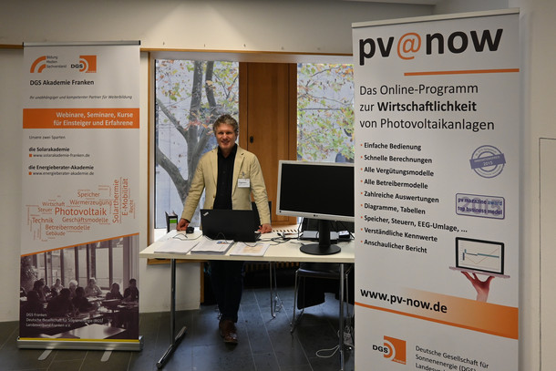 Michael Vogtmann hat (auch schon traditionell) beim Solarbranchentag einen Stand des Landesverbandes Franken mitgebracht und auf die DGS-Angebote von SONNENENERGIE bis zur Software pv@now aufmerksam gemacht. Das ist sinnvoll, denn das Publikum beim Solarbranchentag ist breit gestreut, es ist nicht nur die „reine“ PV-Branche dabei, sondern das Spektrum reicht von Stadtwerken über Beratungsgesellschaften bis zu Forschungseinrichtungen. Gerne wieder im nächsten Jahr!