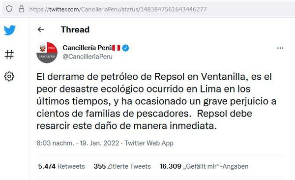 Tine Van Den Wall Bake, Sprecherin des spanischen Unternehmens, sagte peruanischen Medien gegenüber, Repsol sei nicht der Hauptverantwortliche für die Ölkatastrophe. Mitarbeiter hätten am 14. Januar mit Be- und Entladearbeiten begonnen und sich, nach dem Vulkanausbruch auf Tonga, mit der Einheit für Seeverkehr in Verbindung gesetzt. Die habe bestätigt, „dass es keine Warnung für die Küste gab und wir mit der Ladung fortfahren können“ so Bake.