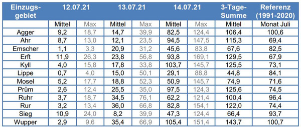 Innerhalb weniger Stunden oder Tage wurden enorme Niederschlagsmengen erreicht. Bezogen auf die Referenzperiode 1991-2020 belief sich diese Menge im Mittel über ganze Flusseinzugsgebiete auf das 1,5 bis 2,0-fache des mittleren Niederschlages im Juli, so der DWD in seinem Bericht. Beispielsweise wurden in Hagen an einer Station des Landesamtes für Natur, Umwelt und Verbraucherschutz mehr als 241 l/m² Niederschlag in nur 22 Stunden gemessen. In Trier „wurden weitflächig mehr als 100 l/m² Niederschlag in 72 Stunden registriert. Regional fielen sogar über 150 l/m² Niederschlag in 24 Stunden“, wie die Bundesoberbehörde berichtet.
