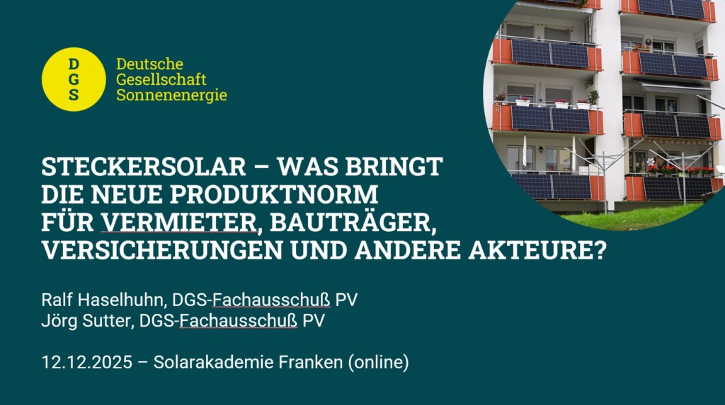 Die Inhalte der Norm und auch explizit die Vorteile für Hausbesitzer, Vermieter und Wohnungsunternehmen, aber auch andere Multiplikatoren, die mit Steckersolargeräten zu tun haben, wird die DGS im dritten Teil einer Webinarreihe ausführlich vorstellen (siehe unten).