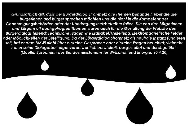 Was der BDS in diesen fünf Jahren unter zentraler Beteiligung der DUH tatsächlich geleistet hat, darüber ist nicht viel zu erfahren. Eine Druckschrift zählt für die Zeit bis Ende 2016 „29 Konferenzen, 191 Stopps mit dem Dialogmobil, 41 Workshops und 145 Infostände auf Wochenmärkten, in Rathäusern und Bibliotheken“ auf. Waren die Menschen mit den Antworten des BDS einverstanden? Fehlanzeige. Aus dem BMWi heißt es dazu: Zitat 2 „Da der Bürgerdialog Stromnetz als neutrale Instanz fungieren soll, hat er dem BMWi nicht über einzelne Gespräche oder einzelne Fragen berichtet.“