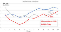 Das heißt konkret: Wenn Ihre Ü20-Anlage seit 1. Januar in der Weiterbetriebs-Option läuft, können Sie derzeit nur abschätzen, was Sie für den Strom bekommen werden. Gemessen am Jahreswert 2020 wird die Vergütung in einer Höhe von 2,458 Cent minus 0,4 Cent Vermarktungskosten, also bei rund 2,06 Cent pro kWh liegen. Doch wie in Grafik 1 zu sehen, war das Jahr 2020 auch hinsichtlich der Strompreise aufgrund Corona ein besonderes Jahr. Der Monatsmarktwert Solar ist im April sogar auf unter einen Cent gefallen. Üblicherweise lag er in den vergangenen drei Jahren zwischen 3 und fünf Cent pro kWh. Ich gehe davon aus, dass die Netzbetreiber die Ü20-Anlagen mit monatlichen Abschlägen (auf Basis des Vorjahres-Marktwertes) vergüten und dann wie bisher mit einer jährlichen Endabrechnung die Korrektur auf den (erst im Folgejahr feststehenden) Jahresmarktwert Solar vornehmen.