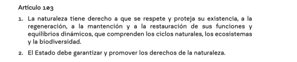 Der Verfassungsentwurf nimmt in mehreren Gesetzesartikeln Bezug auf die Natur. Etwa in Artikel 108, in welchem Respekt gegenüber der Existenz der Natur festgeschrieben wird, und „das Recht auf Schutz, Regeneration, Erhaltung und Wiederherstellung ihrer dynamischen Funktionen und Gleichgewichte, die natürliche Kreisläufe, Ökosysteme und biologische Vielfalt umfassen“. Ergänzend „muss der Staat die Rechte der Natur garantieren und beschützen“. Darüber hinaus widmet sich das gesamte dritte Kapitel des Verfassungsentwurfs der Natur und Umwelt (Artikel 127 bis 150).