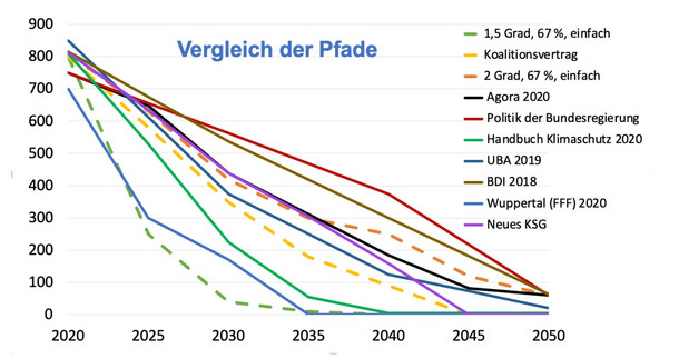 Nicht nur eine oberflächliche Bewertung, sondern auch ein detaillierter Vergleich der verschiedenen Klimapfade hat Karl-Martin Hentschel erstellt, der Autor des „Handbuch Klimaschutz“ seine Auswertung findet sich hier. Sein Fazit: Der Koalitionsvertrag lässt eine Reduzierung der zu erwarteten Emissionen über die im Klimaschutzgesetz genannten Werte hinaus nur in den Sektoren Energie und Hauswärme erwarten.